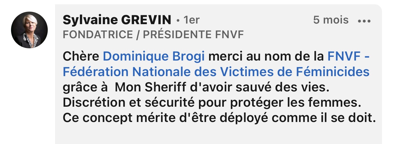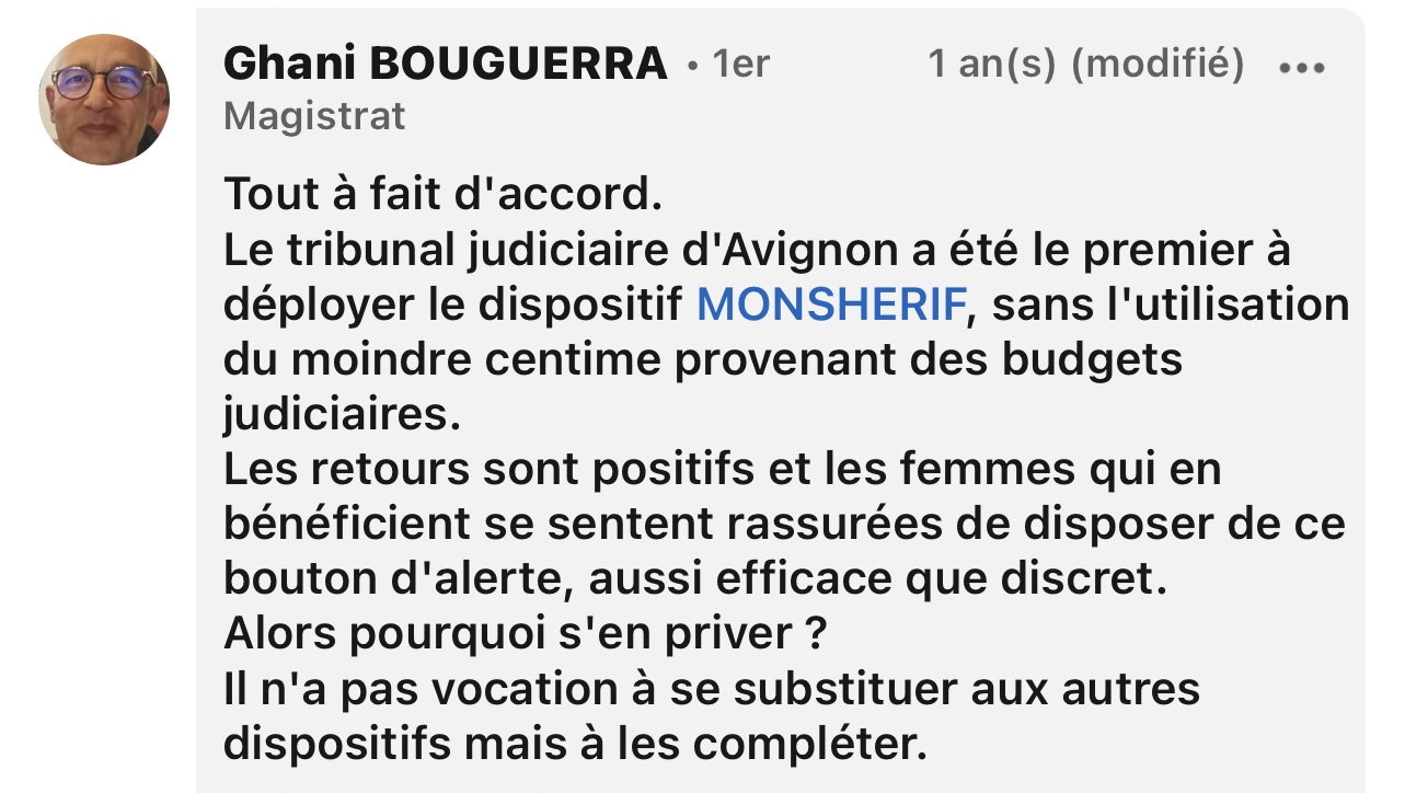 La Présidente du Tribunal au moment du déploiement de la solution, témoigne : « MONSHERIF© est apparu comme un dispositif opérationnel, simple d’utilisation, efficace, dissuasif, rassurant et sécurisant, peu onéreux par rapport aux services rendus et remplissant pleinement son objet. Il permet à des femmes victimes de violences de se protéger des agressions éventuelles et d’apporter la preuve des faits susceptibles d’être commis. Il a été mis à la disposition de femmes qui, pour des raisons procédurales, ne pouvaient encore prétendre au téléphone grave danger. »