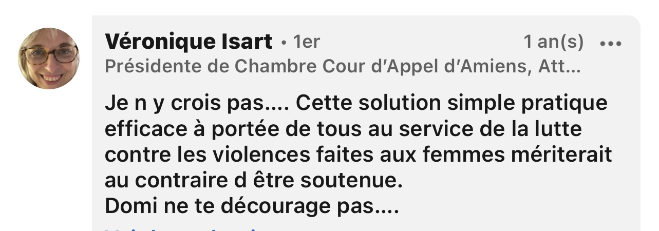 C’est donc d’autres sources de financements que les associations d’aide aux victimes, des magistrats, des avocats, ont continué à remettre des boutons MONSHERIF© sur tout le territoire national, contribuant ainsi à la reconnaissance par la seule réalité des résultats du terrain, de l’efficacité du dispositif MONSHERIF© jusqu’à sauver des femmes en situation de féminicide.